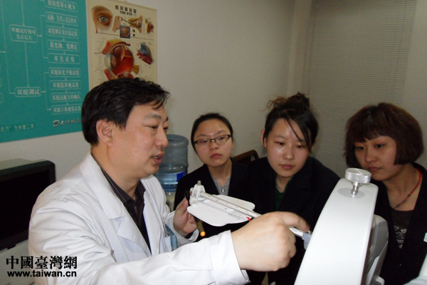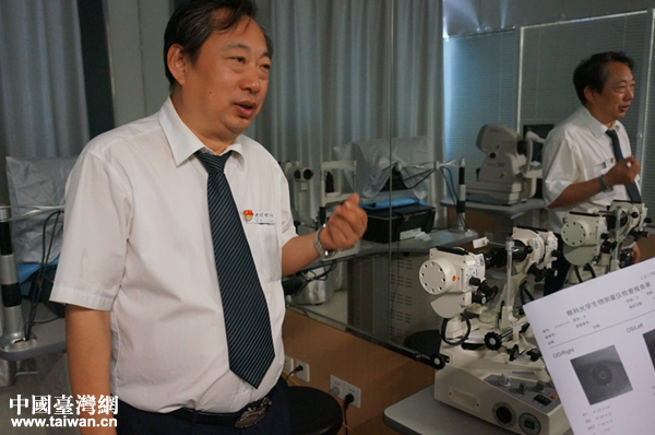 秦英瑞在验光室里解说设备功能。(中国台湾网 雍紫薇 摄)