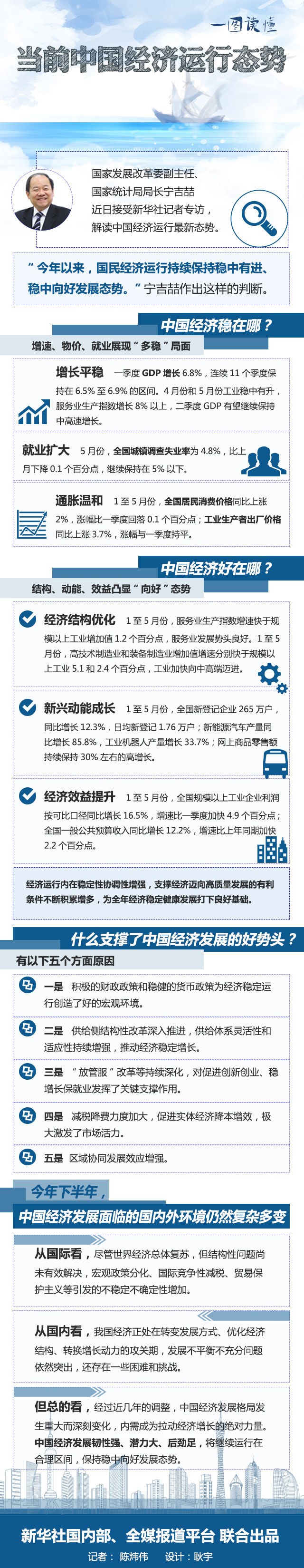 【一图读懂|当前中国经济运行态势】行至年中,中国经济“半年报”即将披露。在复杂的国内外经济形势下,中国经济增长是否稳健?结构能否优化?质量能否提升?风险如何防范?国家发展改革委副主任、国家统计局局长宁吉喆解读中国经济运行最新态势。戳图了解