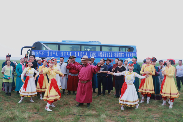 在锡林浩特市宝力根苏木胜利嘎查一片碧绿的草地上,一辆印有“乌兰牧骑”字样的蓝色大巴车缓缓停下,队员们陆续下车,摆放桌椅、调试设备……天为幕布,地为舞台,一场演出就这样开始了。