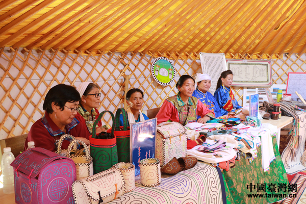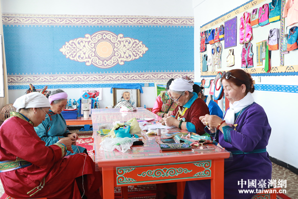 萨仁格日勒(右三)与朋友们缝制民族服饰。(中国台湾网 李宁 摄)