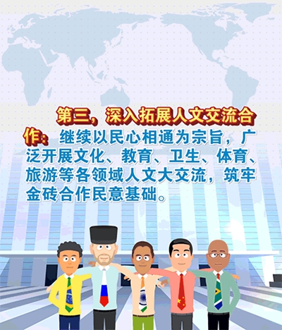 第三,深入拓展人文交流合作。金砖五国孕育出各自灿烂文明,彼此交相辉映,人文交流合作大有可为。去年和今年,金砖人文交流明显提速。我们要继续以民心相通为宗旨,广泛开展文化、教育、卫生、体育、旅游等各领域人文大交流,筑牢金砖合作民意基础。中方建议举行金砖博物馆、美术馆、图书馆联盟联合巡展等活动,加强文化创意产业、旅游、地方城市等领域合作,讲述更多精彩动人的金砖故事,不断增进五国人民相互了解和传统友谊。