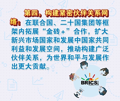 第四,构建紧密伙伴关系网络。金砖机制成立伊始,我们就共同确定了走开放包容之路的正确方向。厦门会晤更确立了“金砖+”合作理念,其要义是在不断强化五国团结协作内核,提升金砖向心力、凝聚力的同时,持续扩大金砖“朋友圈”,同广大新兴市场国家和发展中国家实现共同发展繁荣。我们要在联合国、二十国集团等框架内拓展“金砖+”合作,扩大新兴市场国家和发展中国家共同利益和发展空间,推动构建广泛伙伴关系,为世界和平与发展作出更大贡献。