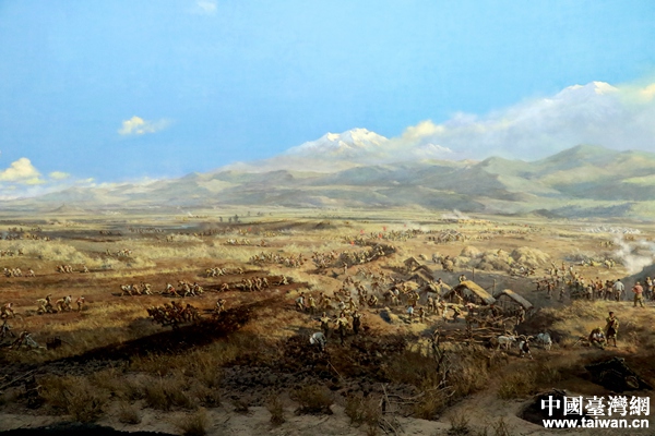 巨幅半景画《屯垦戍边》吸引记者们驻足围观。(中国台湾网 尹赛楠 摄)