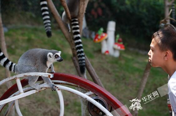 游客正在和环尾狐猴互动。首席记者 雷其霖 摄