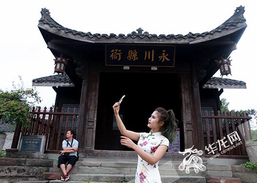 永川县衙的古朴建筑饱含了岁月的沧桑,一名游客正在前门拍照。记者 谢鹏 摄