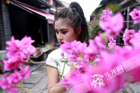 穿着旗袍的美女与古朴的巷道娇艳的花朵相得益彰。记者 谢鹏 摄