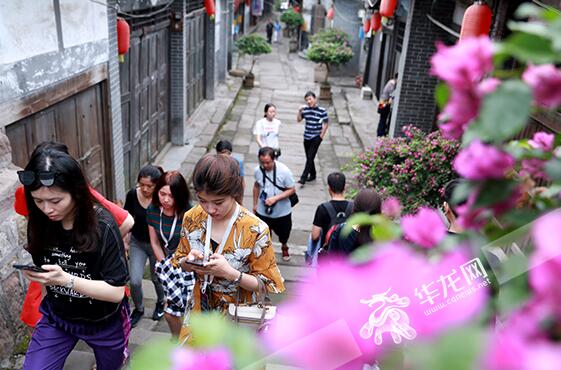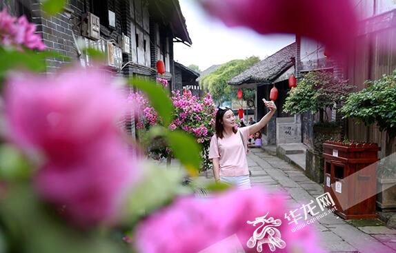 古色古香的巷道,开满了红色的花朵,引得游客不禁自拍留念。记者 谢鹏 摄