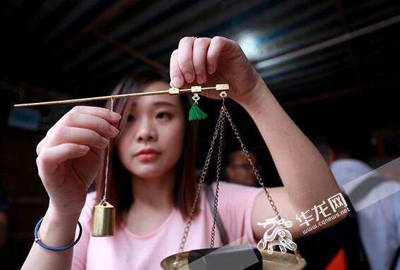 一名网媒行的记者正在体验当地传统的手工制称。记者 谢鹏 摄