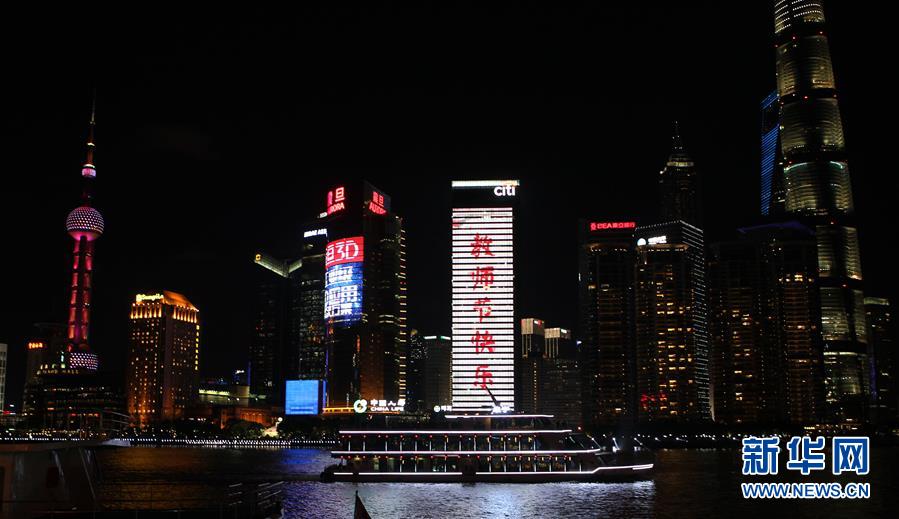 9月9日,上海外滩地标亮灯庆祝教师节,来自同济大学、上海理工大学的学生现场向敬爱的老师献上祝福。 新华社记者 胥晓璇
