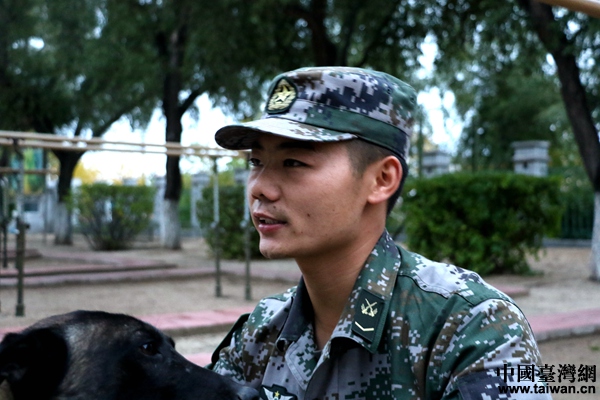 北部战区陆军某边防旅“黑河好八连”军犬训导员付平和他的军犬“泰格”。(中国台湾网 尹赛楠 摄)
