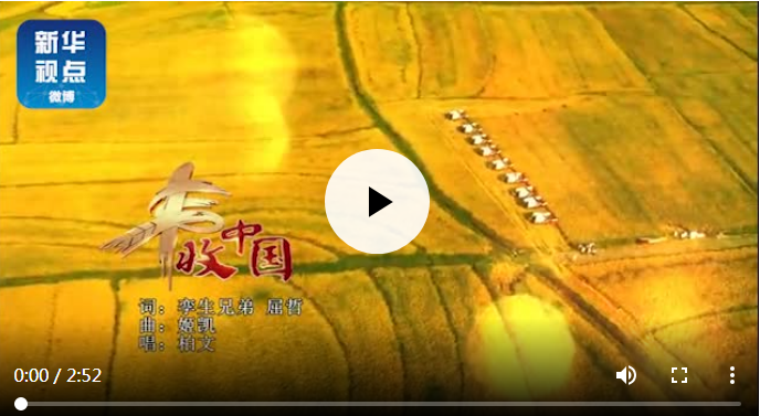 五谷丰,笑声扬;粮满仓,国兴旺。首届“中国农民丰收节”主题曲《丰收中国》歌词简洁大气,旋律优美喜庆,唱出了风吹麦浪的丰收现场,唱出了鸟语花香的乡村景象,唱出了神州大地富足兴旺。准备好了吗?一起来唱《丰收中国》!