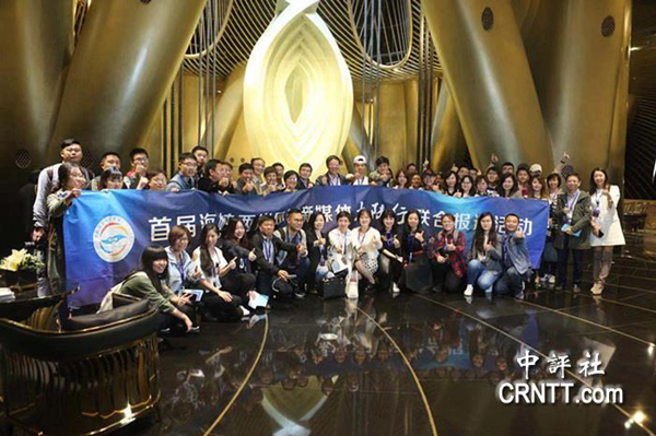 两岸新媒体在“上海之巅”合影留念。(图片来源:中评社)