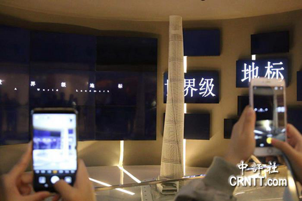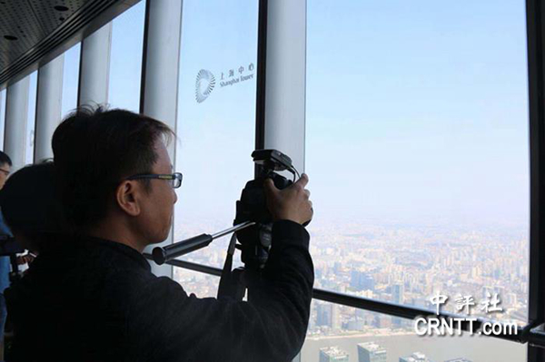 两岸媒体记者从上海中心119层俯瞰城市风光。(图片来源:中评社)
