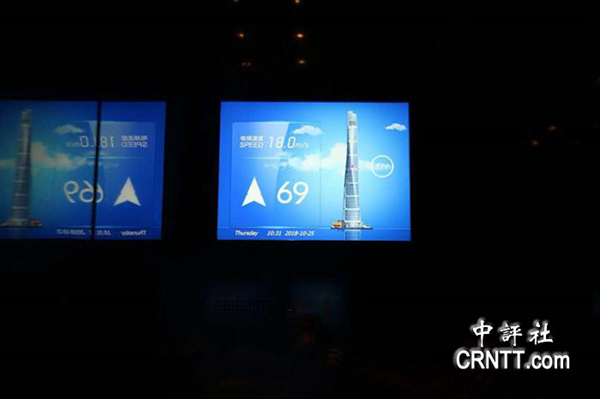 上海中心的超高速电梯可达18m/s。(图片来源:中评社)