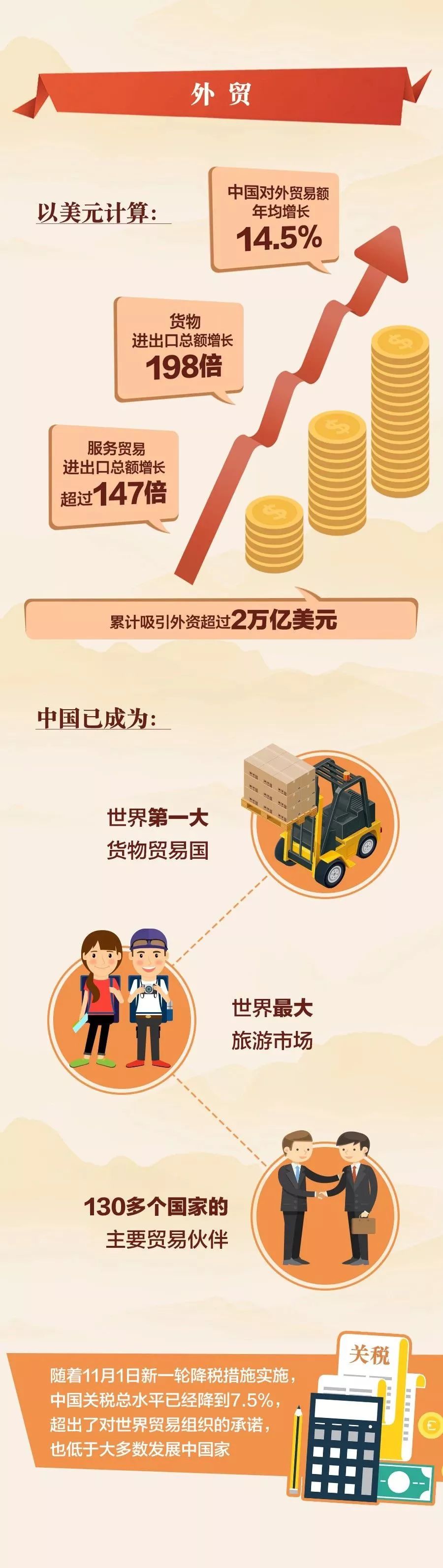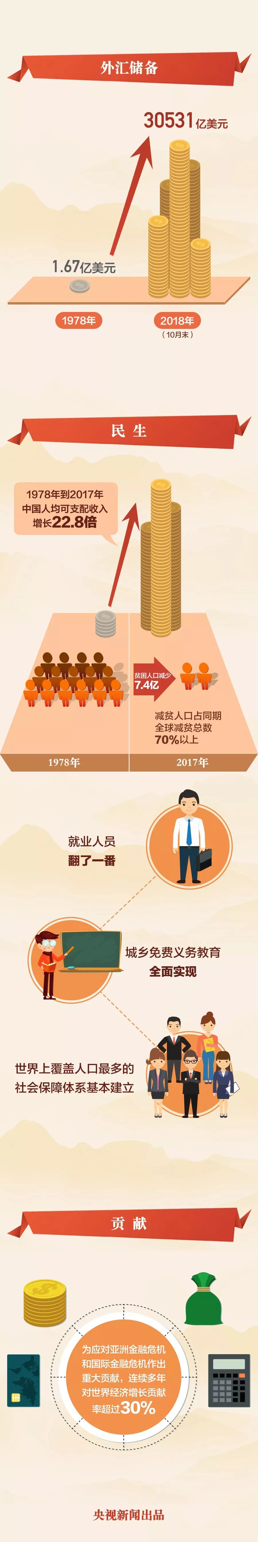 今天,中国已经成为世界第二大经济体、第一大工业国、第一大货物贸易国。用一张图了解改革开放40年间中国的变化,感受那些令人振奋的数字↓↓