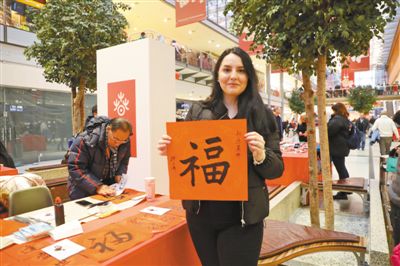 “欢乐春节”走进德国系列活动日前在柏林的波茨坦广场购物中心举行。图为当地民众展示中国书法作品。本报记者 花 放摄
