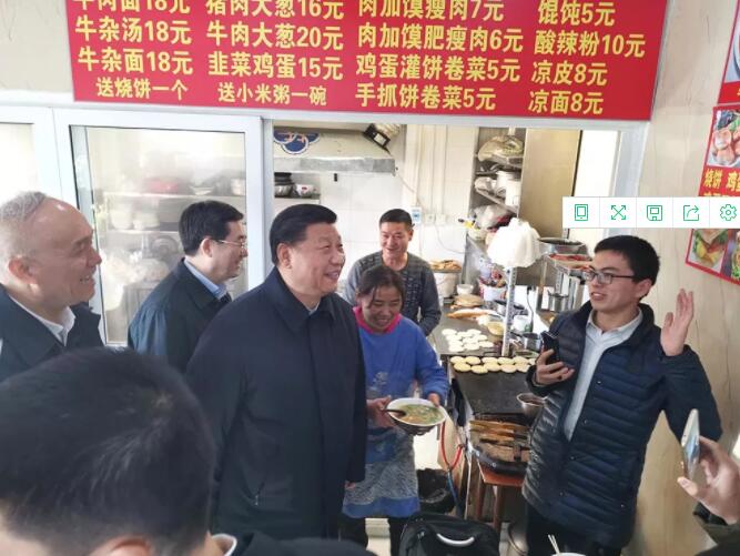 返回途中,习近平临时下车,走进一家路边小餐馆,同店主和顾客热情交流,了解生意怎么样、食材哪里来、味道好不好,并祝他们生意兴隆。