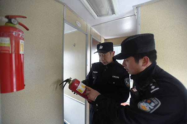 ↑武汉铁路公安局襄阳公安处民警对增开旅客列车消防器材进行巡查。