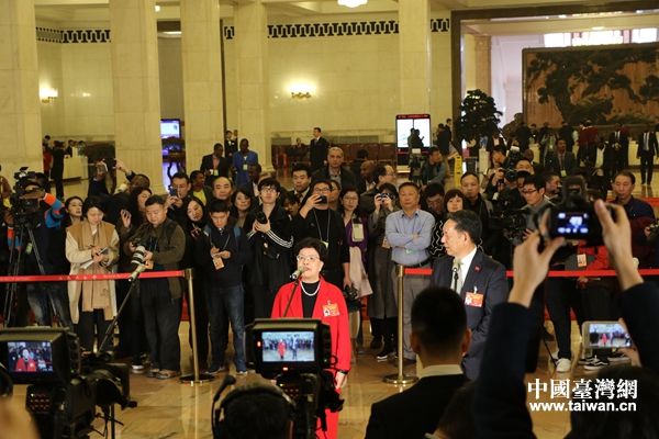 海霞委员回答记者提问。(中国台湾网 雍紫薇 摄)