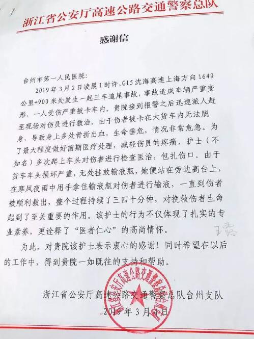 台州高速公路方面因此给医院写来感谢信,让医院找到并表扬一下这位女护士。
