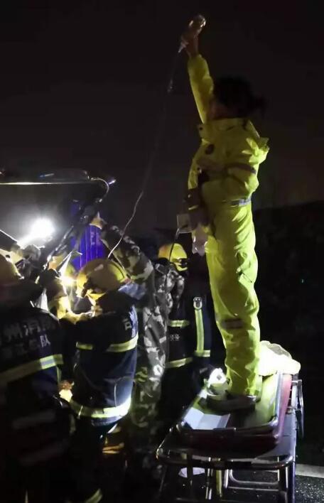 焦急中王露让旁边的消防官兵帮忙举着输液瓶,自己一路奔向急救车,以最快的速度将平车推到伤员旁边,随后爬上平车,淋着雨高举输液瓶方便抢救。