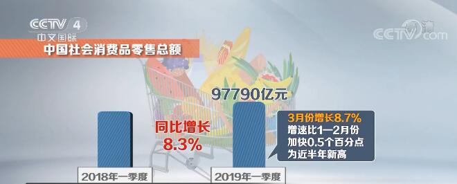 五一小长假期间,中国各地消费市场供需两旺,交出靓丽成绩单。数据显示,一季度中国社会消费品零售总额达97790亿元,同比增长8.3%。其中,3月份增长8.7%,增速比1-2月份加快0.5个百分点,为近半年新高。一季度最终消费支出对经济增长贡献率达65.1%,消费升级跑出加速度。一季度消费升级类商品销售增长较快,规模以上商业企业,化妆品类、通讯器材类商品同比分别增长10.9%和10%,增速分别快于社会消费品零售总额2.6个百分点和1.7个百分点。一季度全国实物网上商品零售额实现1.78万亿元,同比增长21%,占社会消费品零售总额的比重达18.2%,较上年同期提高2.1个百分点。