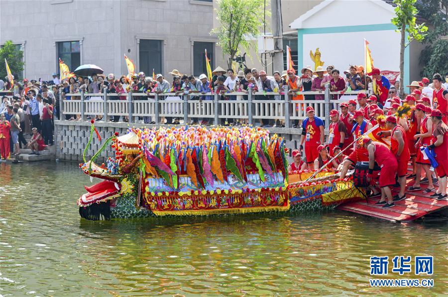 6月3日,在浙江省湖州市长兴县倪家田村,一艘花龙舟准备下水。 端午将至,人们参加多彩民俗活动迎接传统节日的到来。 新华社发(谭云俸摄)