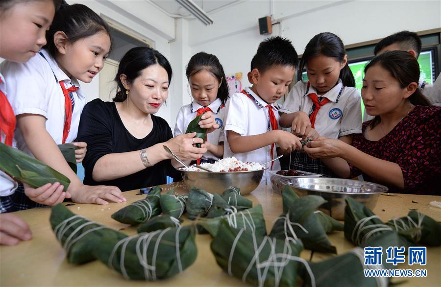 6月3日,河北省邯郸市浴新南小学学生在老师指导下学包粽子。 端午将至,人们参加多彩民俗活动迎接传统节日的到来。 新华社发(郝群英摄)
