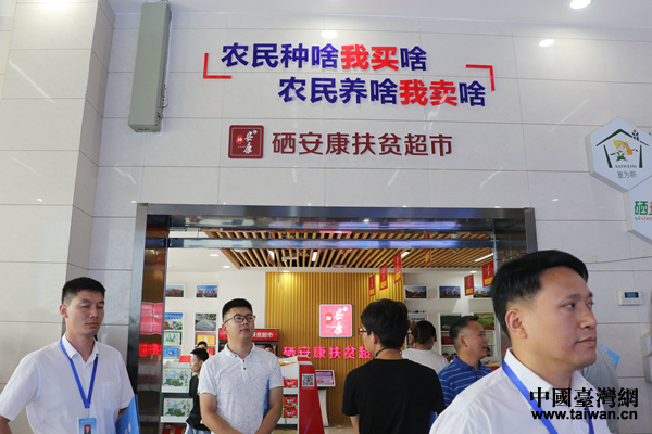 硒安康扶贫超市门口打着“农民种啥我买啥,农民养啥我卖啥”标语,展示了园区电商创业和带动农民脱贫致富的决心。(中国台湾网 李宁 摄)