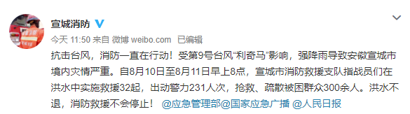 在灾情严重的安徽宣城,自8月10日至8月11日早上8点,宣城消防指战员们在洪水中实施救援32起,出动警力231人次,抢救、疏散被困群众300余人。洪水不退,消防救援不会停止!