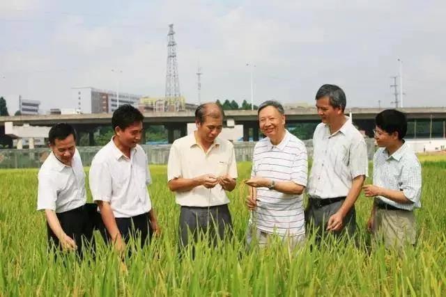 △ 卢永根(右三)团队在田间观察水稻生长情况 图源:南方日报