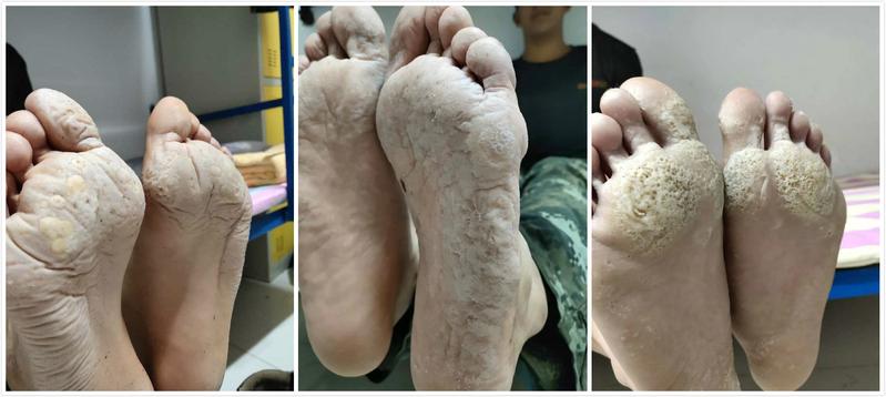 回忆起拍摄时的情景,王俊男告诉记者,当时已经晚上9点45分马上就要熄灯了,他在宿舍看到大家都把鞋子脱下来晾脚,就顺手拍了下来,他说:“这样的脚我们有一百多双,差不多都这样。”短短的一句话,却让人忍不住泪奔。