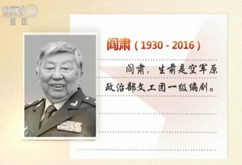 阎肃,生前是空军原政治部文工团一级编剧。从艺60余年,阎肃始终模范践行党的文艺路线,坚持以人民为中心的创作导向,战斗在讴歌主旋律、弘扬民族精神第一线,创作《江姐》《党的女儿》《我爱祖国的蓝天》等一大批红色经典,推出1000多部深受人民群众喜爱、无愧于时代的精品力作,参与策划100多场重大文艺活动。