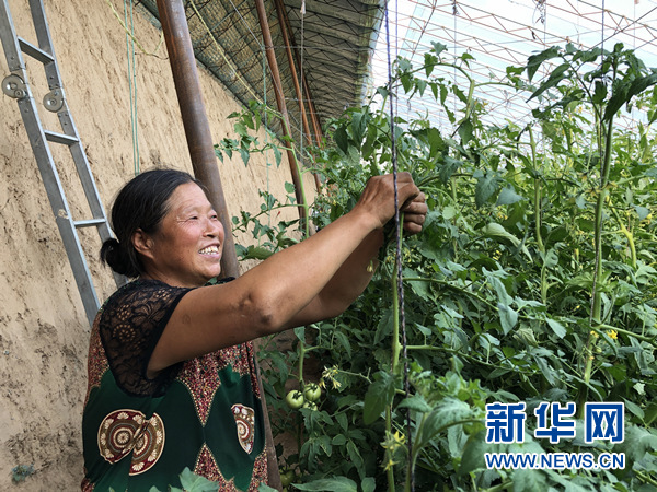 图为刘贵荣在自家大棚打理西红柿。新华网汪亚/摄
