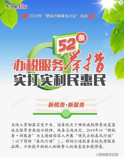 2019年以“新税务 新服务”为主题继续深入开展“便民办税春风行动”,出台4大类13项52条便民办税服务举措,持续打造税务系统优质服务品牌,不断提升纳税人和缴费人的满意度和获得感。