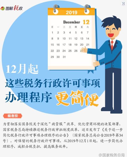 为贯彻落实深化“放管服”改革、优化营商环境,税务总局持续推进税务行政审批制度改革,发布《公告》进一步简化税务行政许可事项办理程序、部分税务行政许可文书和报送材料。压缩办理时间,对部分税务行政许可事项在20个工作日的法定办结时限基础上明确了更短的承诺办结时限;简并申请文书,减少填报事项,合并申请表单;减少对纳税人延期缴纳税款的核准事项的申请材料和对纳税人延期申报的核准事项的申请材料;简化送达程序,实行更加便捷的送达和签收方式等,减轻了纳税人办税负担,提高了税务部门服务效率。