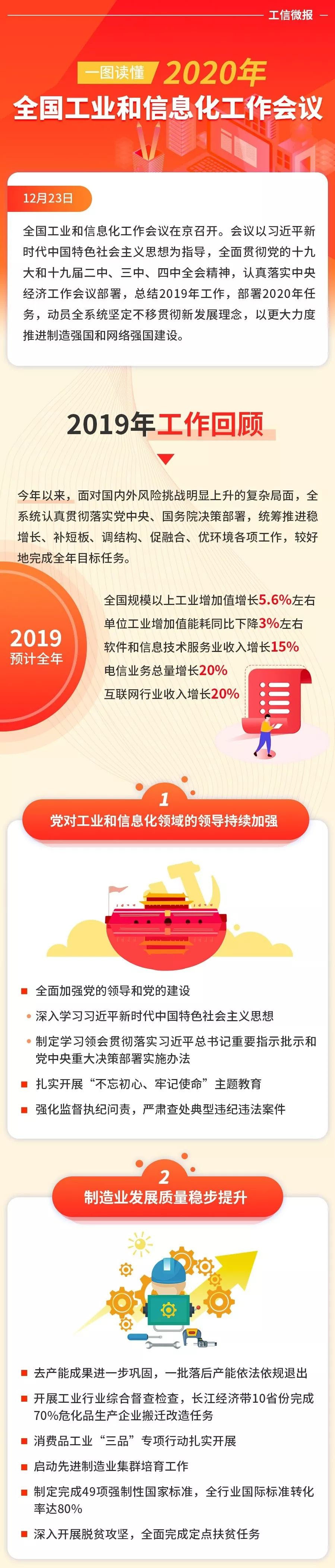 12月23日,全国工业和信息化工作会议在京召开。会议以习近平新时代中国特色社会主义思想为指导,全面贯彻党的十九大和十九届二中、三中、四中全会精神,认真落实中央经济工作会议部署,总结2019年工作,部署2020年任务。会议具体说了啥?一图读懂↓↓