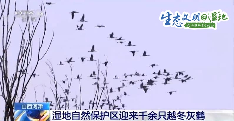 央视网消息: 近日,在山西河津市黄河湿地自然保护区迎来了千余只越冬的灰鹤。偶尔有几只翩翩起舞、向天空飞去,构成了一幅独特的“候鸟天堂画卷”。