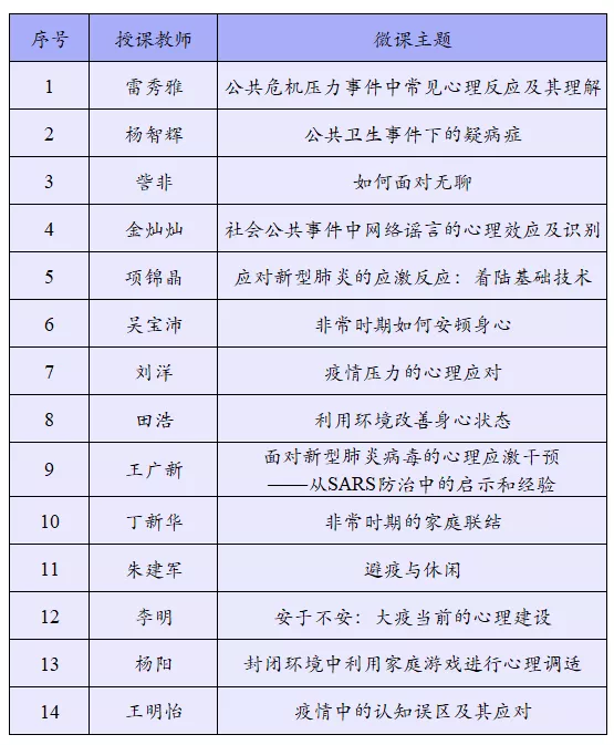 目前已确定的微课讲座共计14讲,均由北京林业大学心理系教师讲授,包括:应对类和相关知识类等,详情请见下表(后期还会持续增加新的讲座主题,敬请关注)。