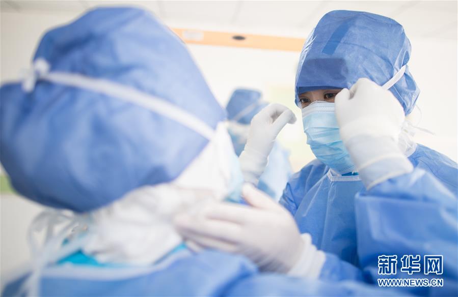 2月22日,医务人员在武汉市第一医院进入隔离病区前穿戴隔离装备。医护人员分组轮班进入隔离病区工作,每次进入都要认真准备近半小时,至少穿戴8件装备,穿越5道隔离门进入“红区”,在里面工作6个小时。武汉市第一医院专门配备了督导员帮助医护人员穿戴和检查疏漏。