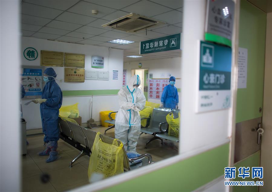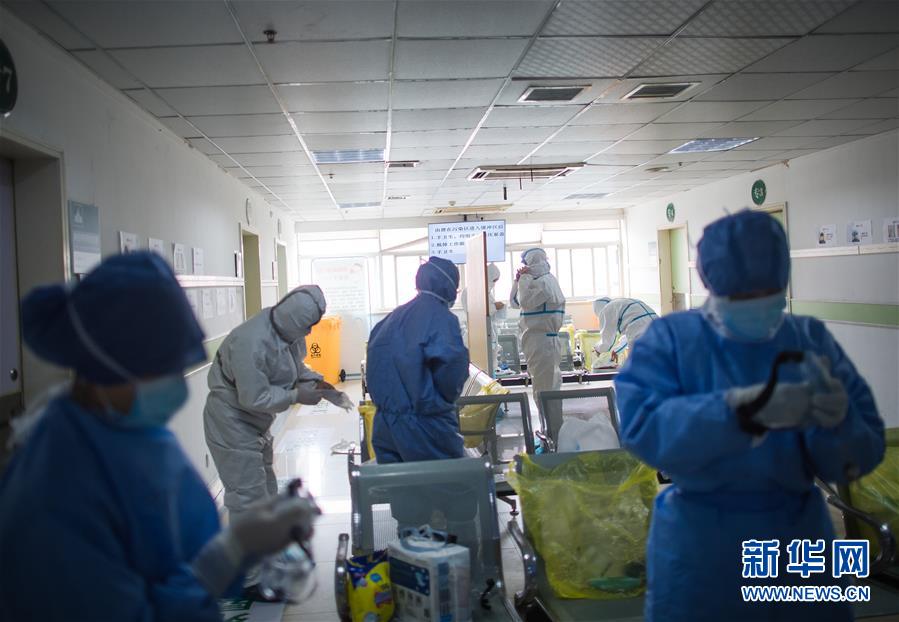 2月22日,医务人员在武汉市第一医院隔离病区排队等待进入缓冲区,换掉污染衣物。新华社记者 肖艺九 摄