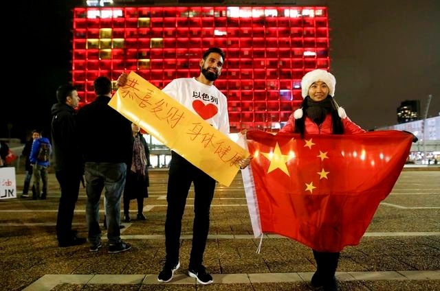 2月11日,在以色列特拉维夫市政大楼前,在以华人和以民众表达对中国的祝福。新华社发(吉尔·科恩·马根摄)