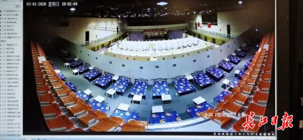 硚口武体方舱医院休舱当天下午6时,通过监视器里面看到的方舱医院全景。