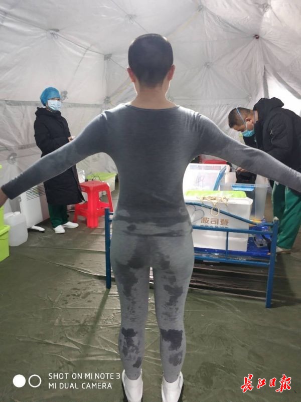 硚口武体方舱医院,护士出舱前脱掉被污染的防护服和隔离衣,走到用帐篷搭建的清洁区,用酒精进行全身消杀处理。
