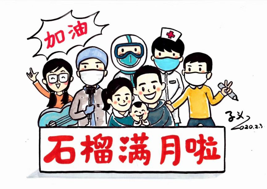 在华中科技大学同济医院的新生儿监护室里,有个出生不久的婴儿叫“小石榴”。“小石榴”出生前,父母均确诊新冠肺炎,2月3日小石榴一出生后就住进了新生儿重症病房。虽然爸爸妈妈不在身边,但有一群护士妈妈一直守护着他,更有很多普通人通过直播镜头关注“小石榴”的成长,“小石榴”健康状况良好,两次核酸检测呈阴性,2月19日转入普通病房。3月3日,“小石榴”迎来了满月“云派对”,爱他的人送来暖心祝福。网友手绘了一张“满月全家福”,一直关注着宝宝的医护人员、记者、热心网友等也都出现在这张全家福中。