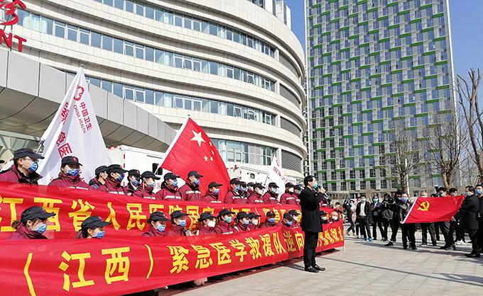 2月9日上午11时,在江西省人民医院红谷滩院区门前,9辆标有国家紧急医学救援队字样的专业救援车正整装待发驰援武汉,嗡嗡作响的引擎声伴随着激昂壮阔的宣誓声让人感受到这次出征的意义非同寻常。