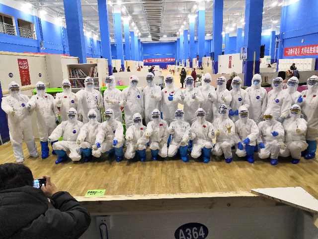 △国家(江西)紧急医学救援队队员们在方舱医院内合影