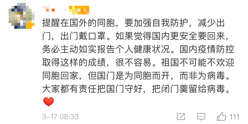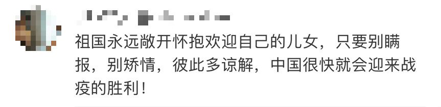 一些网友认为,祖国永远欢迎自己的儿女回来,但为了防控疫情,归国人员不应瞒报身体状况,并要配合国内集中隔离管理。↓↓↓