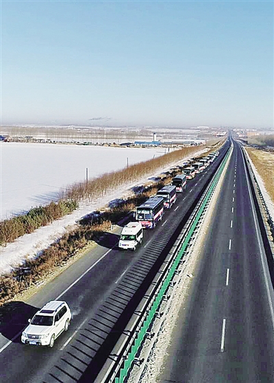 三月十三日,黑龙江省“点对点”输送务工人员的大客车行驶在高速公路上。新华社发(李志强摄)