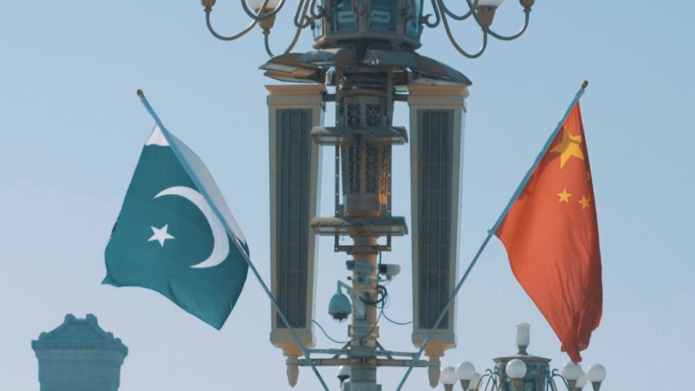 △当天,长安街两侧的华灯上悬挂起中巴两国国旗